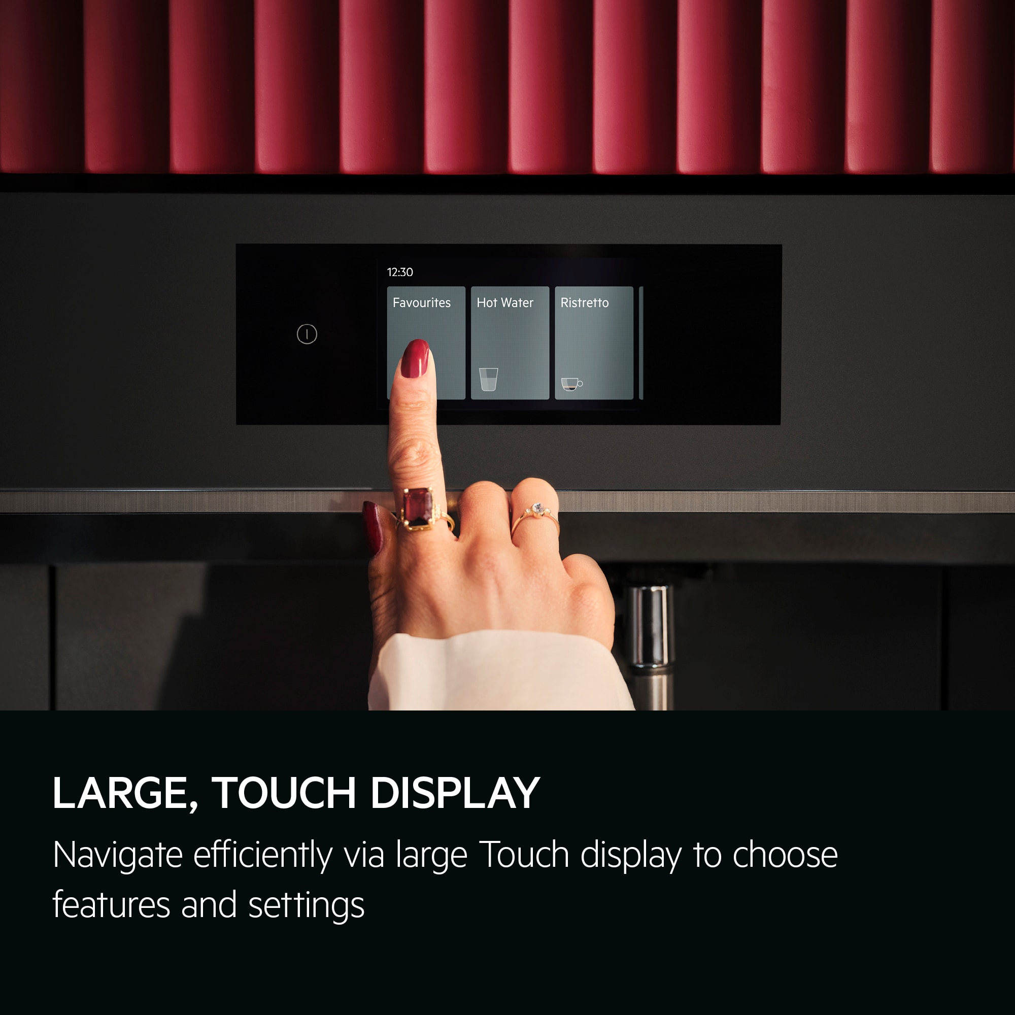 Built-in espresso bar with touchscreen control for efficient navigation. Prepare and enjoy a selection of coffee, espresso, and other hot drinks exactly the way you want them at home.