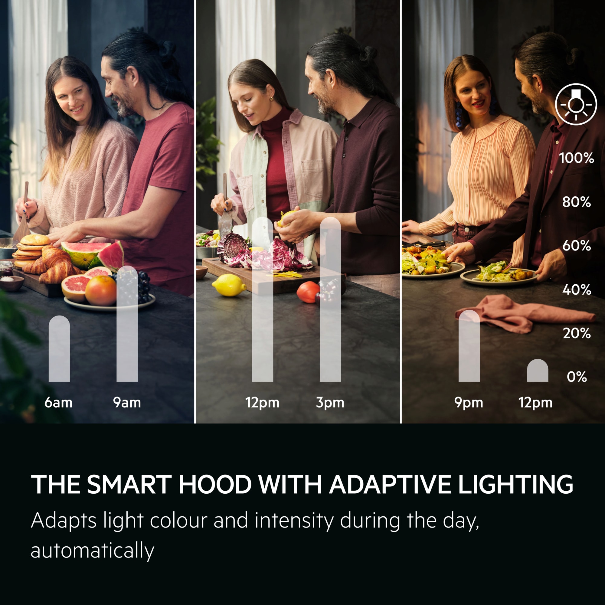 The 8000 AuroraTech® Hood introduces smart lighting to your kitchen. It automatically adapts the illumination colour and intensity based on the time of day, creating the perfect ambiance. Use the app for the smart lighting experience.