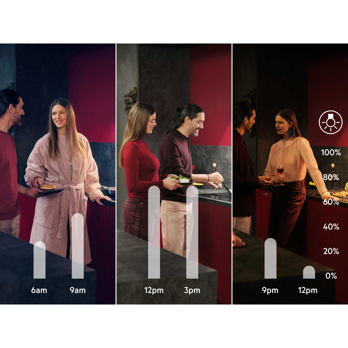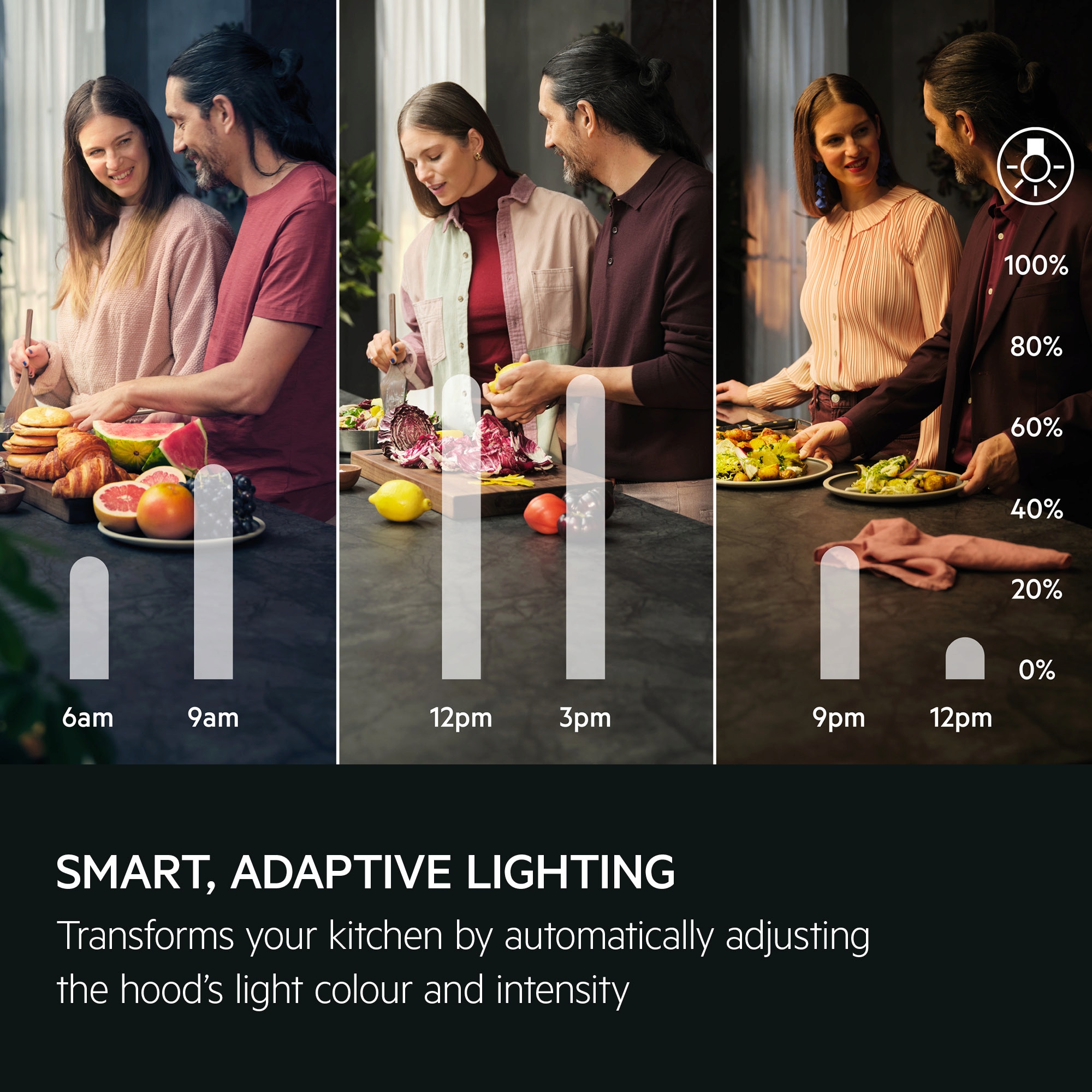 The 8000 AuroraTech® Hood introduces smart lighting to your kitchen. It automatically adapts the illumination colour and intensity based on the time of day, creating the perfect ambiance. Use the app for the smart lighting experience.
