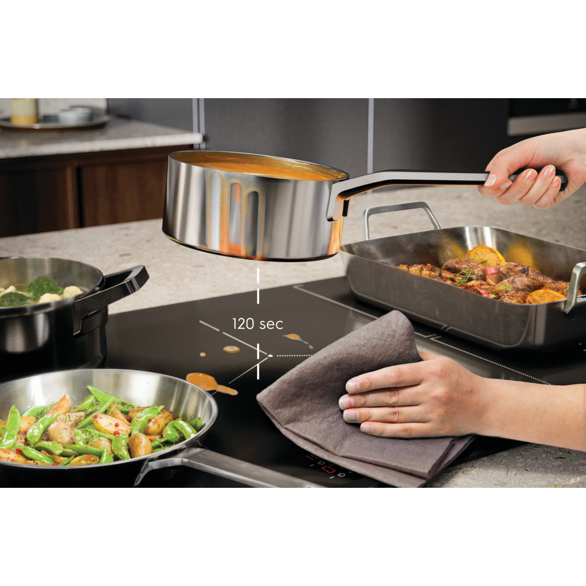 The 6000 Bridge Induction Hob can easily cope when you're cooking with bigger pans. The Bridge function links two cooking zones on two sides of the hob to fit any large or long pan. The bridged zone will share the same temperature and time.
