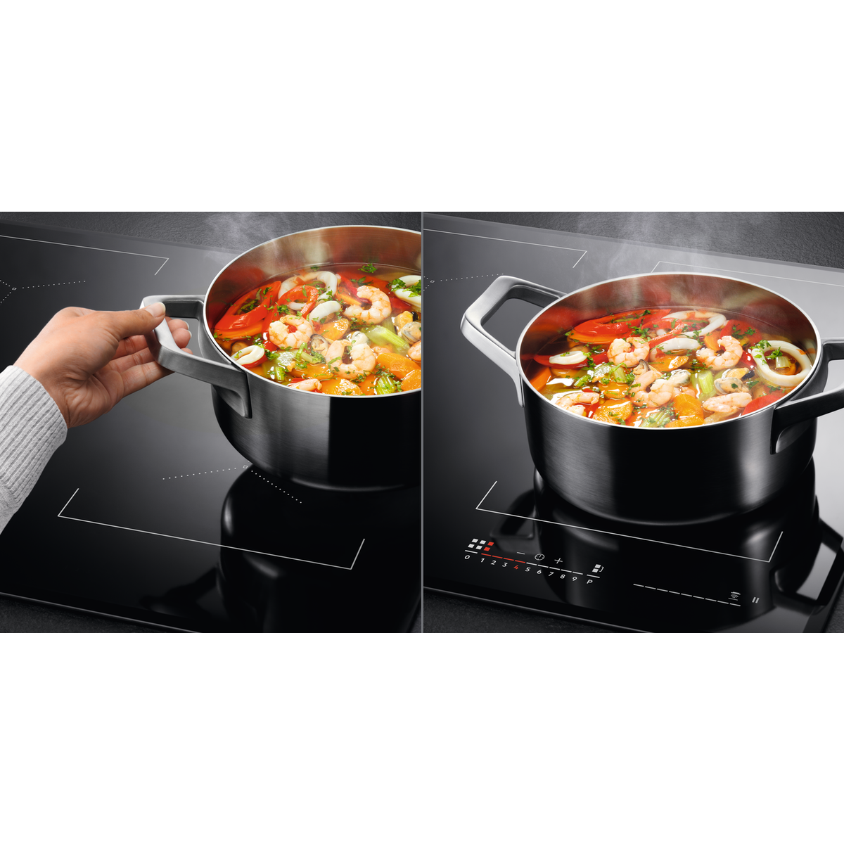 The 6000 TotalFlex Hob automatically detects pots and pans of various shapes and sizes, and creates a dedicated cooking zone for them. Offering you the freedom to move pots and pans almost anywhere on its responsive glass surface.