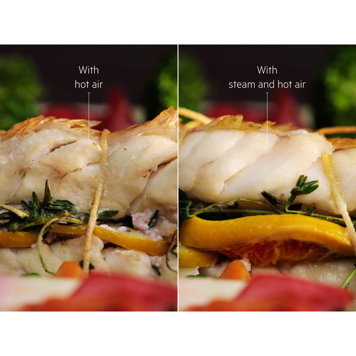 Disclaimer: Based on external test comparing tenderness of chicken (up to 4% more) and salmon (up to 20% more) cooked with and without combining steam and hot air.