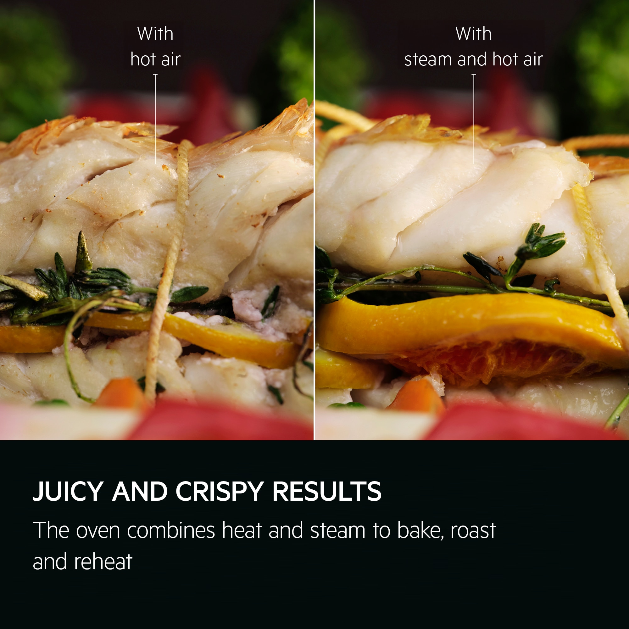 The SteamCrisp® multifunction oven combines heat and steam to bake, roast and reheat. This combination keeps dishes crispy on the outside and juicy on the inside – meat is jucier and fish is up to 20% more tender vs a non-steam oven.