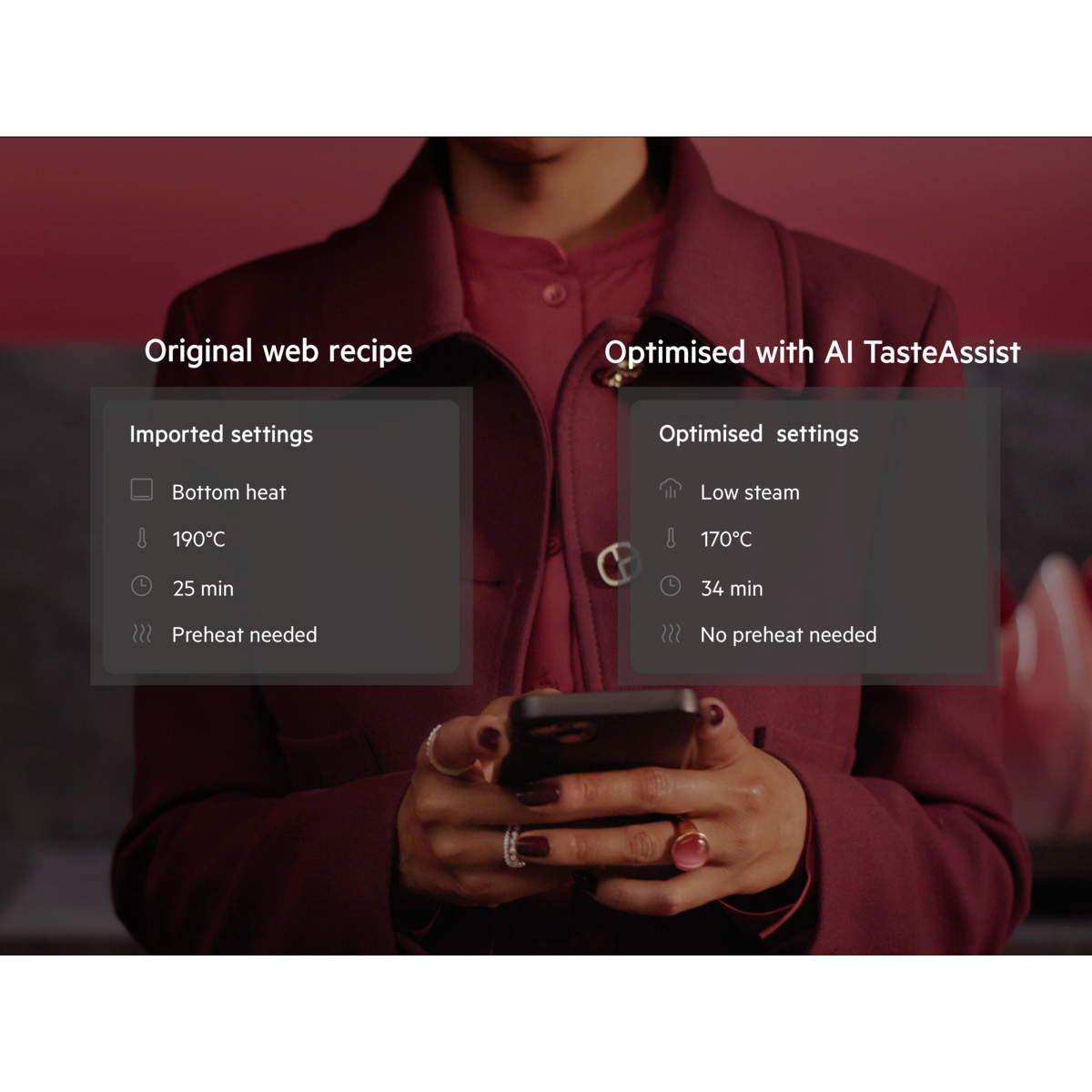 AI TasteAssist transforms traditional recipes with steam. Simply send a web recipe to your oven via our app and let AI optimise the time, temperature and function, helping you create more nutritious, delicious dishes with less energy.