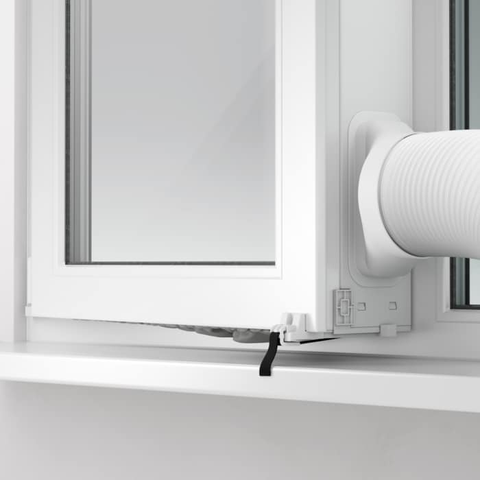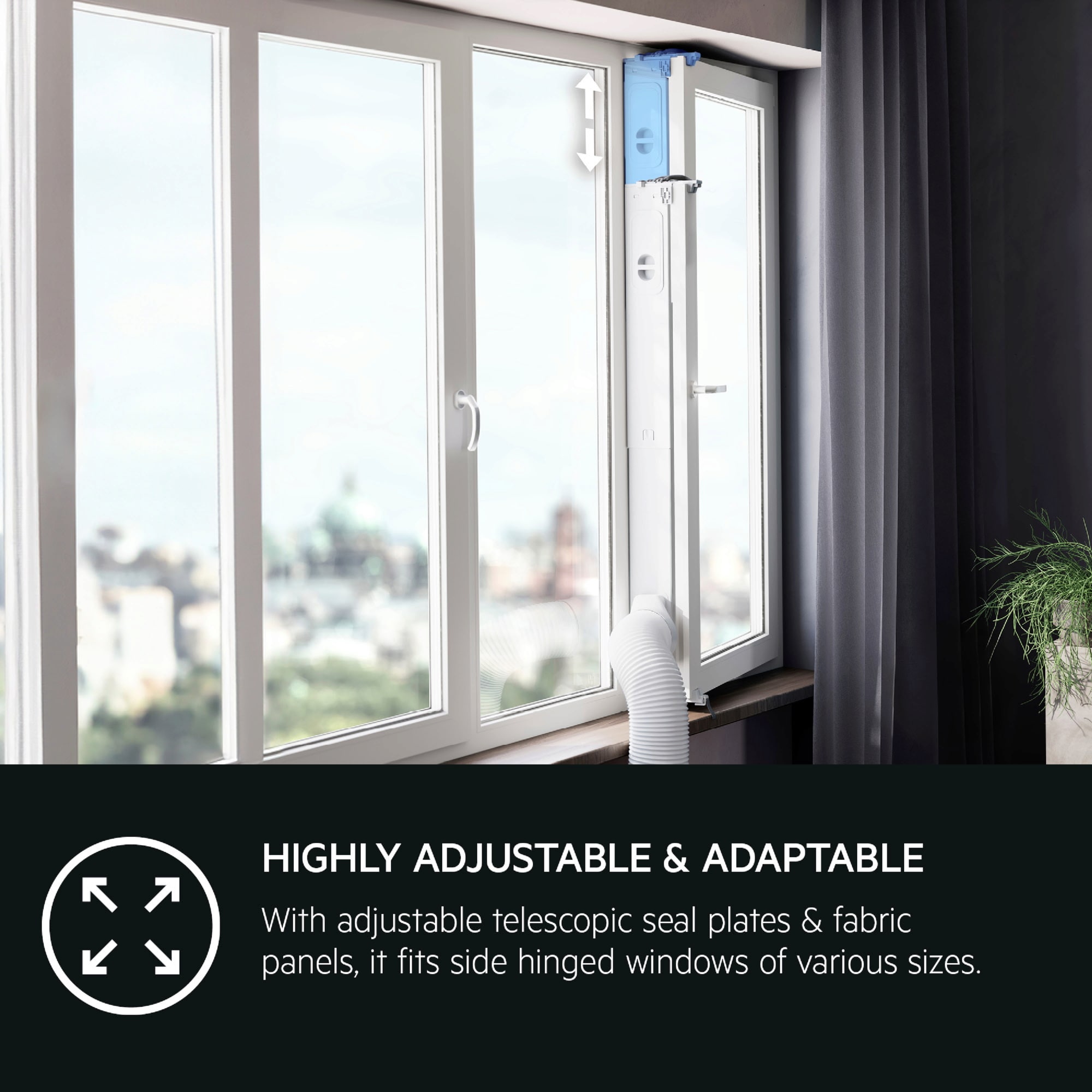 Toolless installation for side hinged window types, for faster and more energy efficient cooling of the room. Fast fit clamps and extendable fabric side covers allow for quick and easy installation. Designed to keep warm air out saving up to 28% energy and cooling the room up to 50% faster.