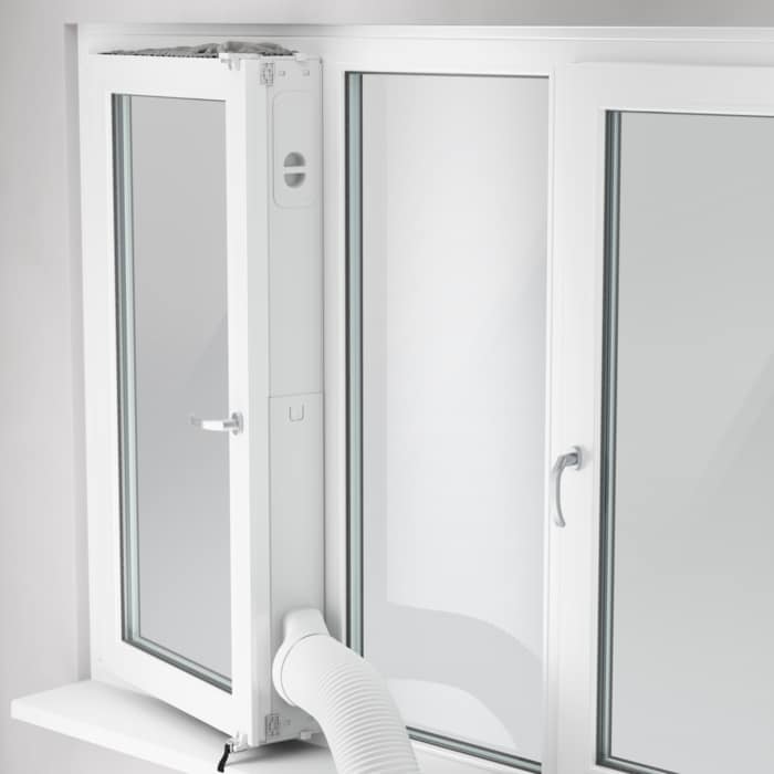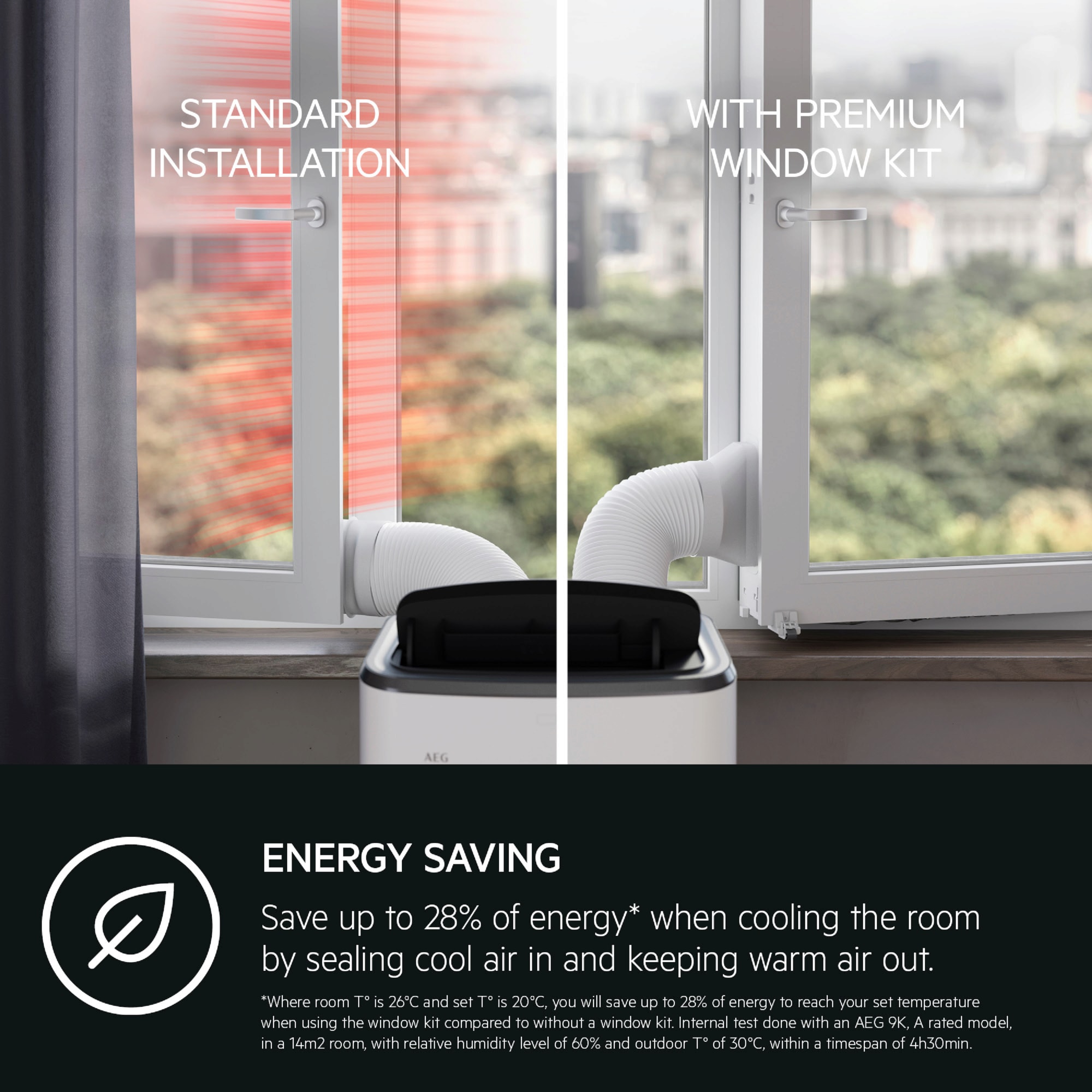*Where room T° is 26°C and set T° is 20°C, you will save up to 28% of energy to reach your set temperature when using the window kit compared to without a window kit. Internal test done with an AEG 9K, A rated model, in a 14m2 room, with relative humidity level of 60% and outdoor T° of 30°C, within a timespan of 4h30min.