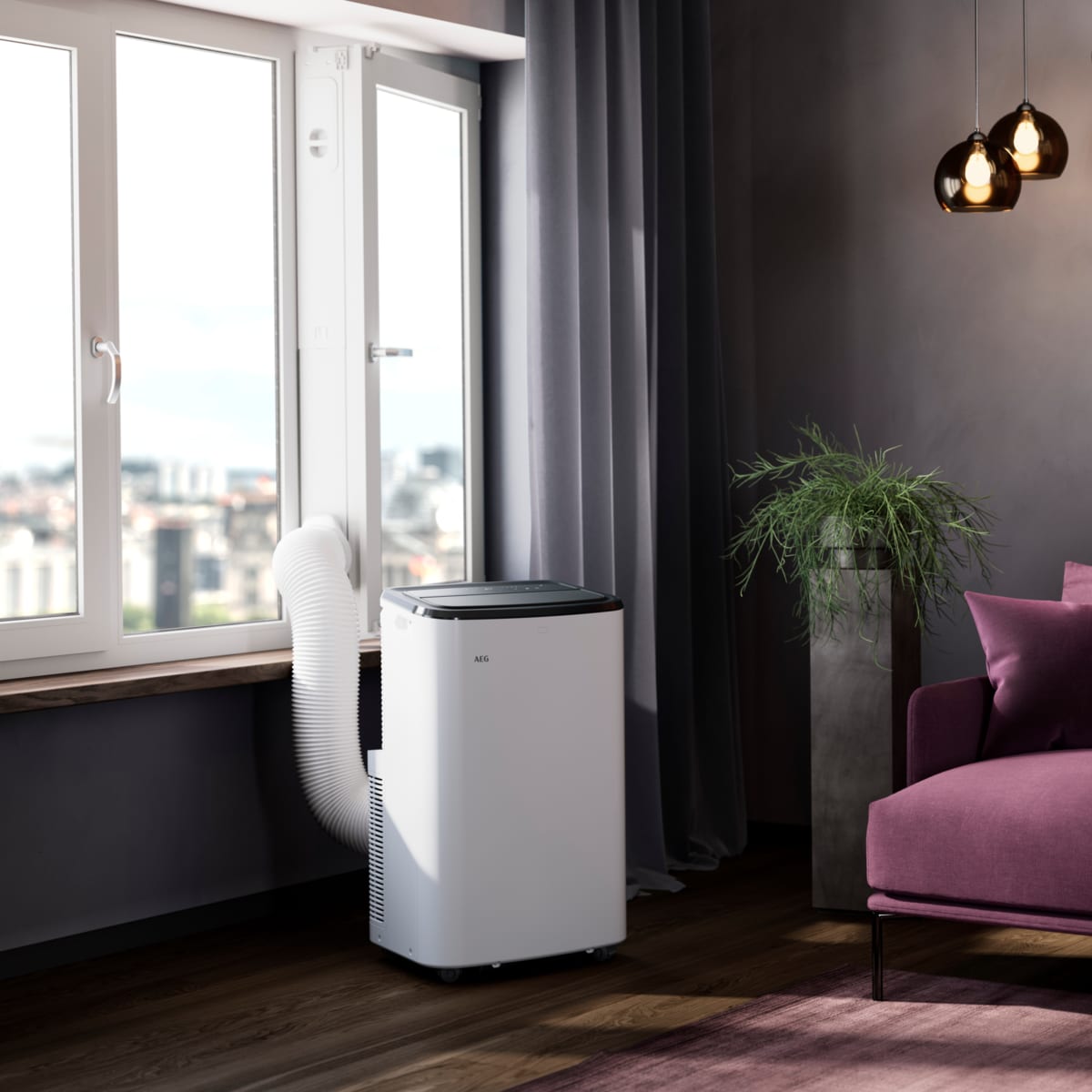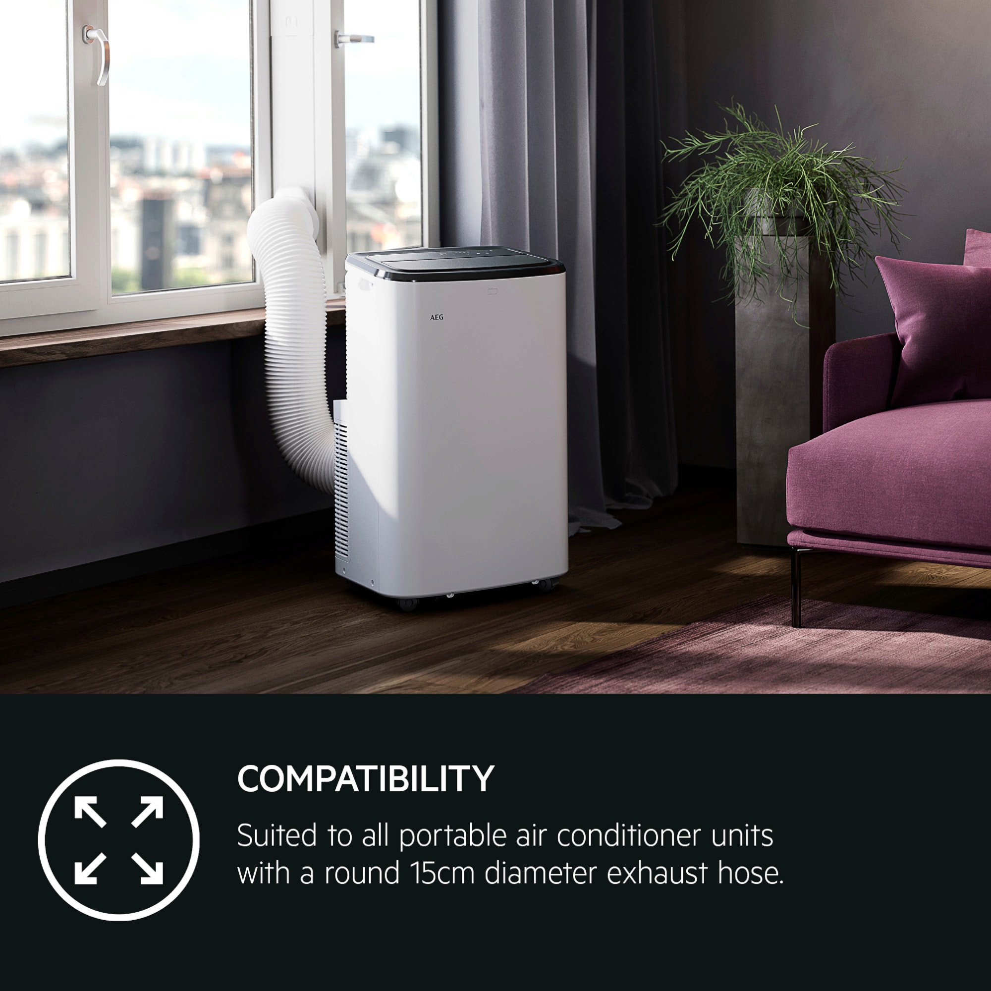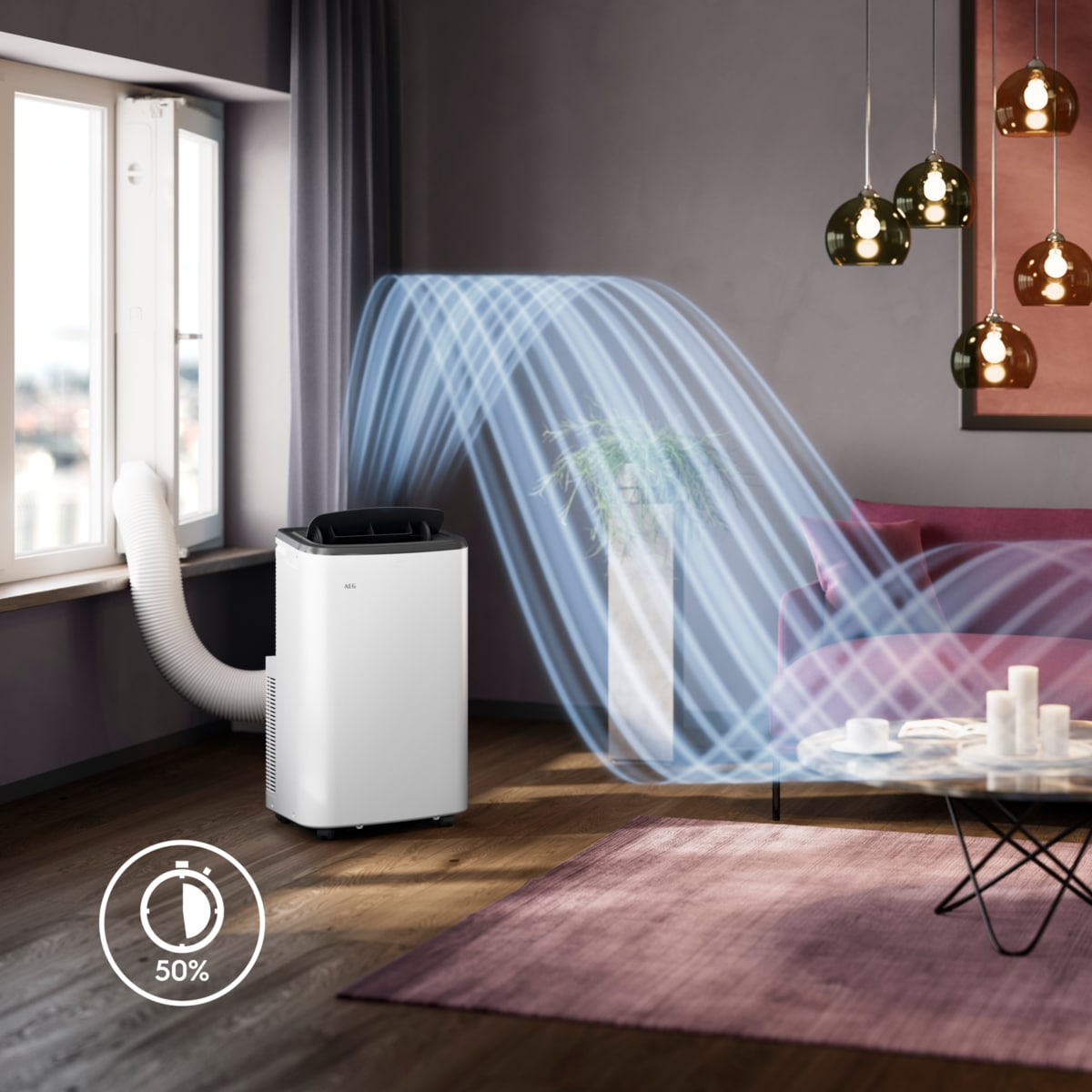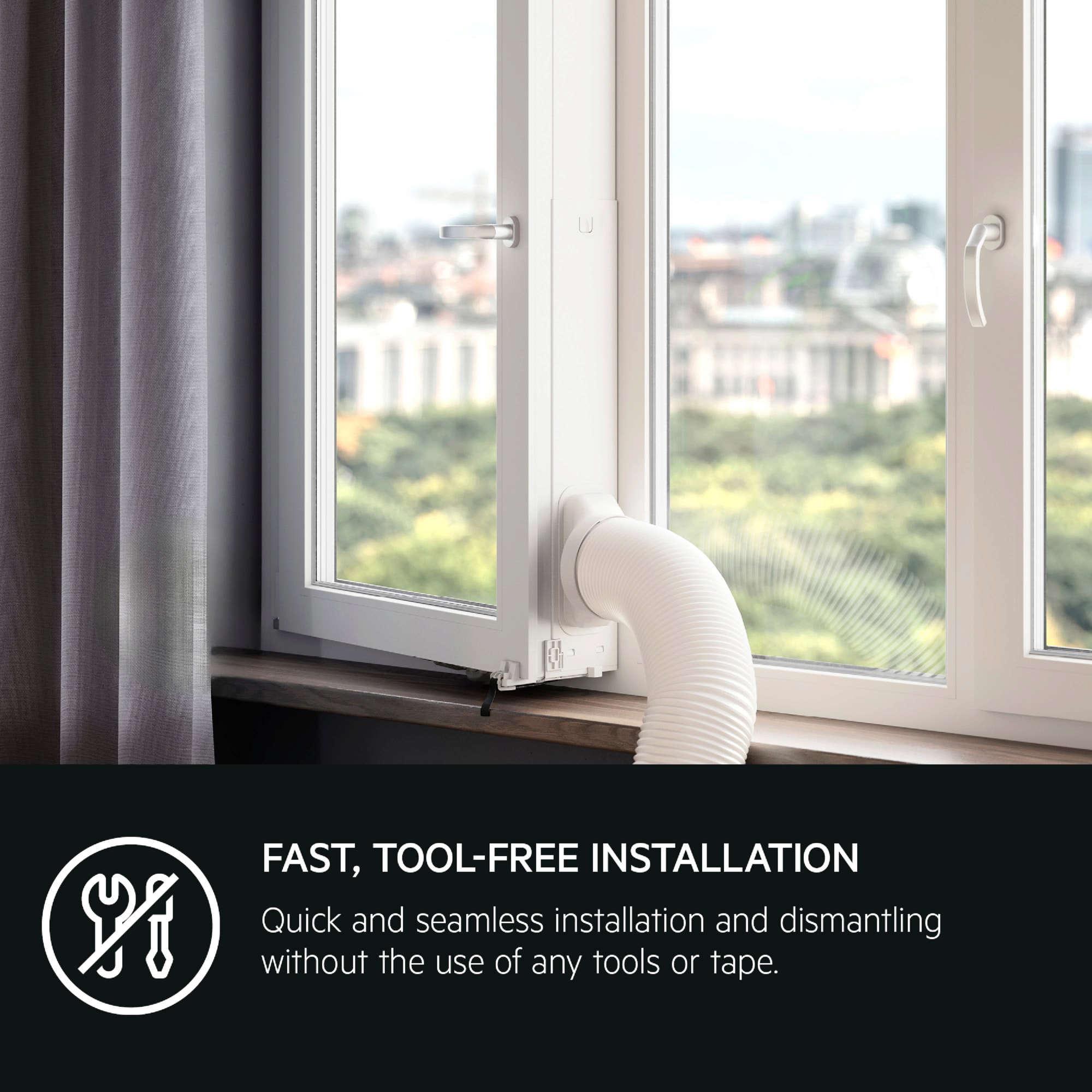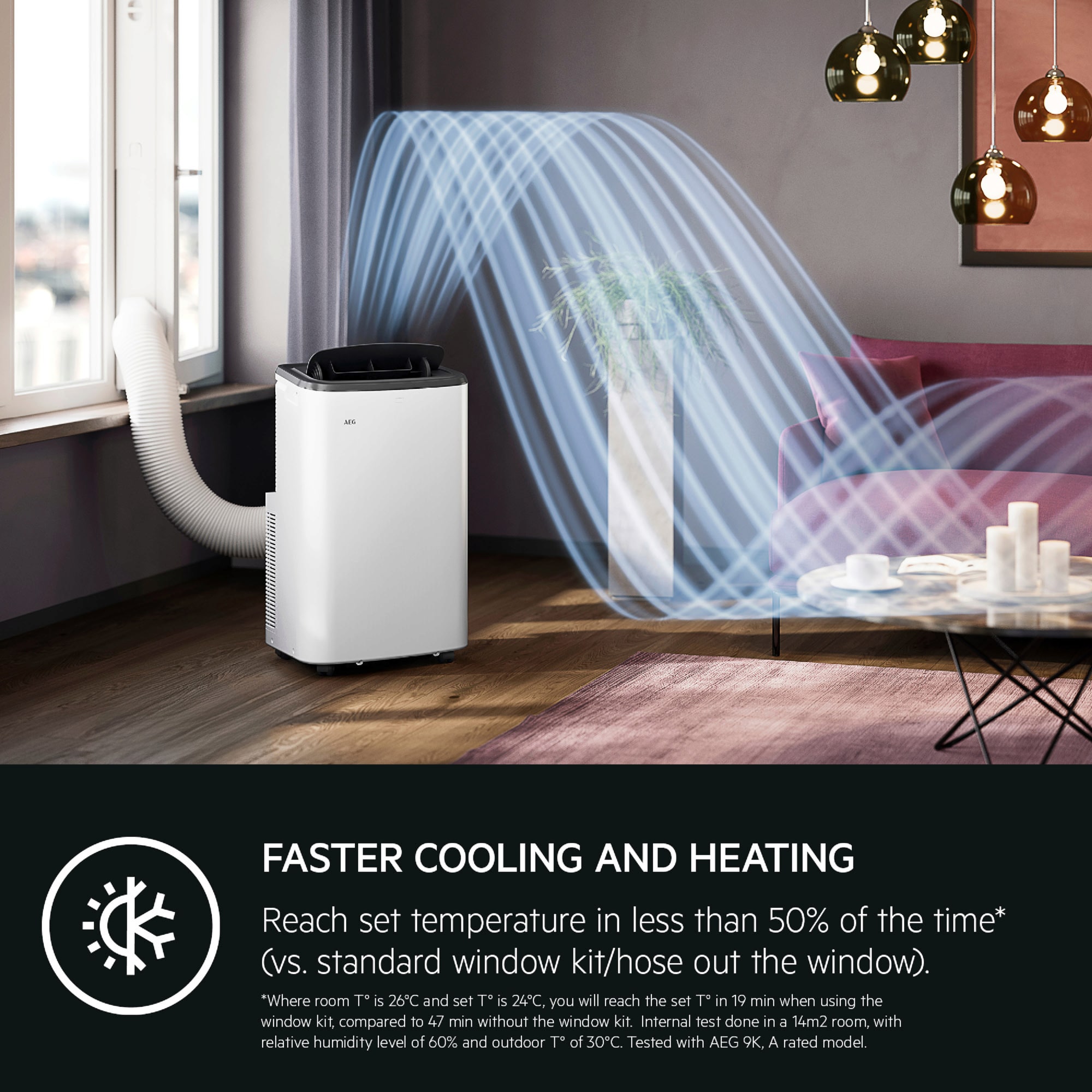 *Where room T° is 26°C and set T° is 24°C, you will reach the set T° in 19 min when using the window kit, compared to 47 min without the window kit. Internal test done in a 14m2 room, with relative humidity level of 60% and outdoor T° of 30°C. Tested with AEG 9K, A rated model.