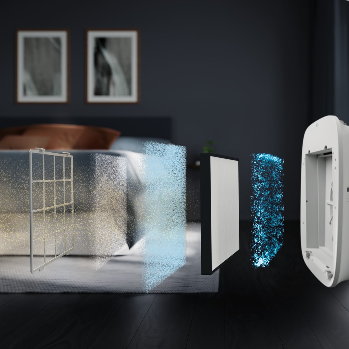 *Neutralises up to 99.99% of captured airborne viruses (tested for Influenza A virus A/PR8/34 H1N1) based on external test in 2020 according to ISO 18184-2019. Not tested for SARS-CoV-2.